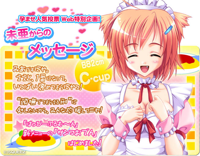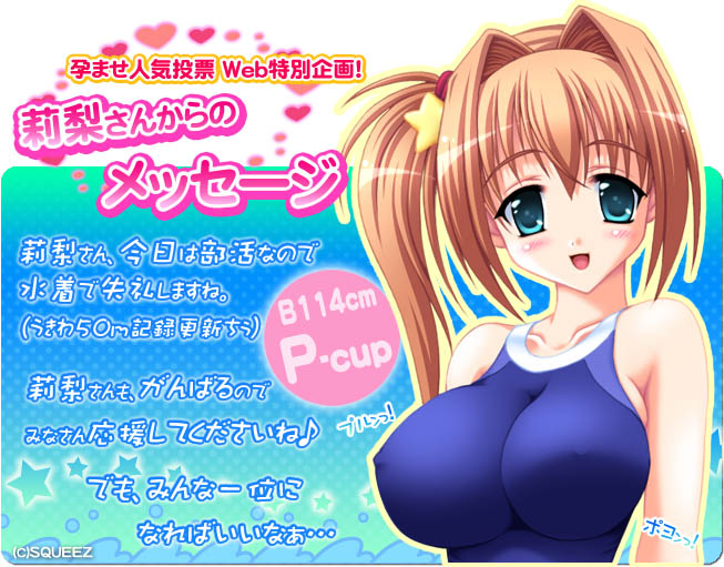 【第2回 「炎の孕ませ同級生」 孕ませ人気投票Web企画 2010/12/29】 同級生 孕ませ応援メッセージ! + ウィキ乳(ちち)リークス さて、第2回の人気投票も中盤にさしかかりましたところで 同級生の皆様方に、インタビューをして参りました。(みなさん、相変わらずのノリですが…w) 「+ウィ乳リークス」? また、最近世間ではインターネットの普及によりリークが問題化している中、 我々も同級生達の知られざる『おっぱい裏リーク情報』を乳手(にゅうしゅ)いたしました! けしからんおっぱいエピソードを眺めつつ、是非、応援してあげてくださいね。。 今回の人気投票の「マ乳(にゅぅ)フェスト」は 「上位にランクインした同級生」が、開発進行中(乳プロジェクト)ソフトに選抜 されるということで、ぜひぜひお気に入りのクラスメイトを応援してあげてくださいマセ。 ![]() ![]() ![]() ![]() >>> 『炎の孕ませ同級生』 TOPページへ戻る <<< >>> SQUEEZ TOP ページへ戻る <<< (C)SQUEEZ 2010-2011 |